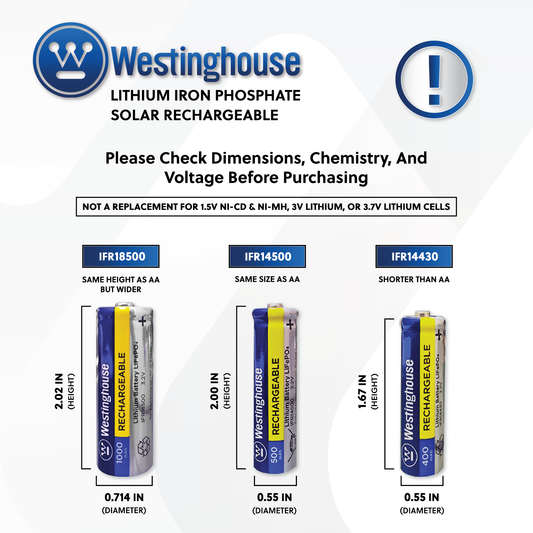 Westinghouse Life-PO4 18500 3.2v 1000mah Solar Rechargeable Box Pack of 8