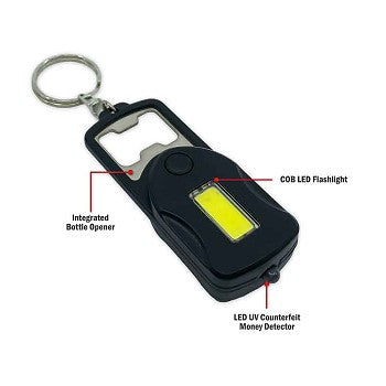 Flipo Microlux 3-In-1 COB LED Keychain Tool-Flashlight, Safety Light, Counterfeit Currency Light, and Bottle Opener