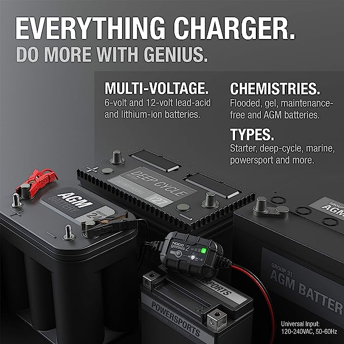 The GENIUS2, a cutting-edge, high-performance, and exceptionally efficient portable universal battery charger. Unleash the power of this compact device, designed for versatility and reliability in charging and maintaining 6-volt and 12-volt heavy-duty batteries. With a 2-amp (30 -watt) output, it operates seamlessly on 100-240VAC 50-60Hz power supply.