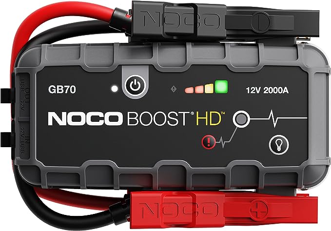 The NOCO GB70 UltraSafe Portable Car Jump Starter is a compact and powerful solution designed to exceed expectations. With dimensions of 7.4"D x 3.7"W x 12.6"H and a weight of just 5 pounds, this advanced 2000-amp lithium battery jump starter is a reliable companion for all your automotive needs.